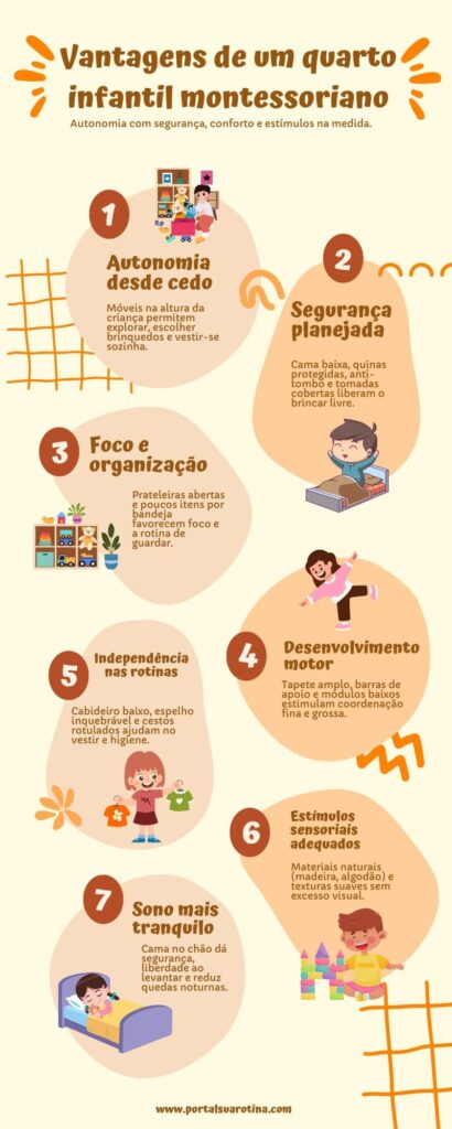 A ideia é que ela possa interagir com o ambiente livremente, sem precisar da ajuda constante de um adulto. Isso significa camas baixas, móveis acessíveis e liberdade de circulação.