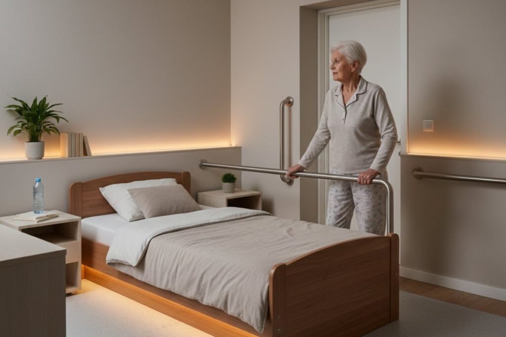 Cama na altura adequada, barras de apoio e espaço livre ao redor ajudam a reduzir esforço e manter a estabilidade durante movimentos simples.