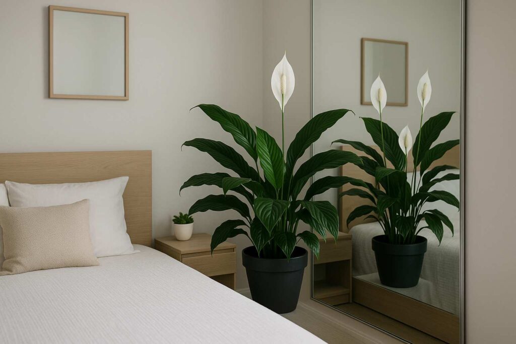 Em um quarto de casal com espelhos em uma das paredes, foi posicionado um vaso médio de lírio da paz em frente aos espelhos, criando um efeito visual duplicado que ampliou a sensação de verde no ambiente sem a necessidade de muitas plantas.