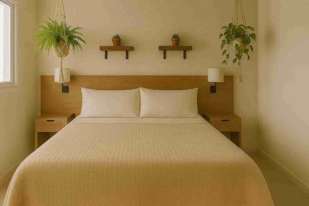 Em quartos pequenos, utilizar suportes de parede ou nichos verticais é uma solução eficiente para incluir plantas sem ocupar espaço no piso.