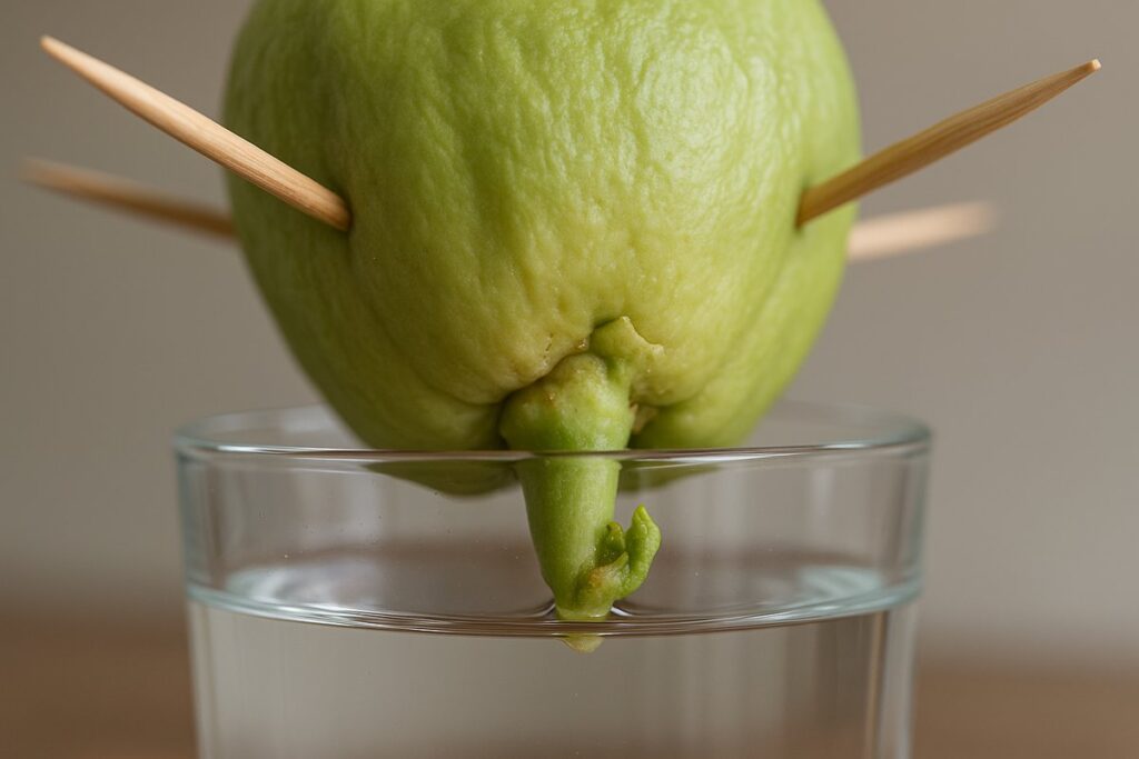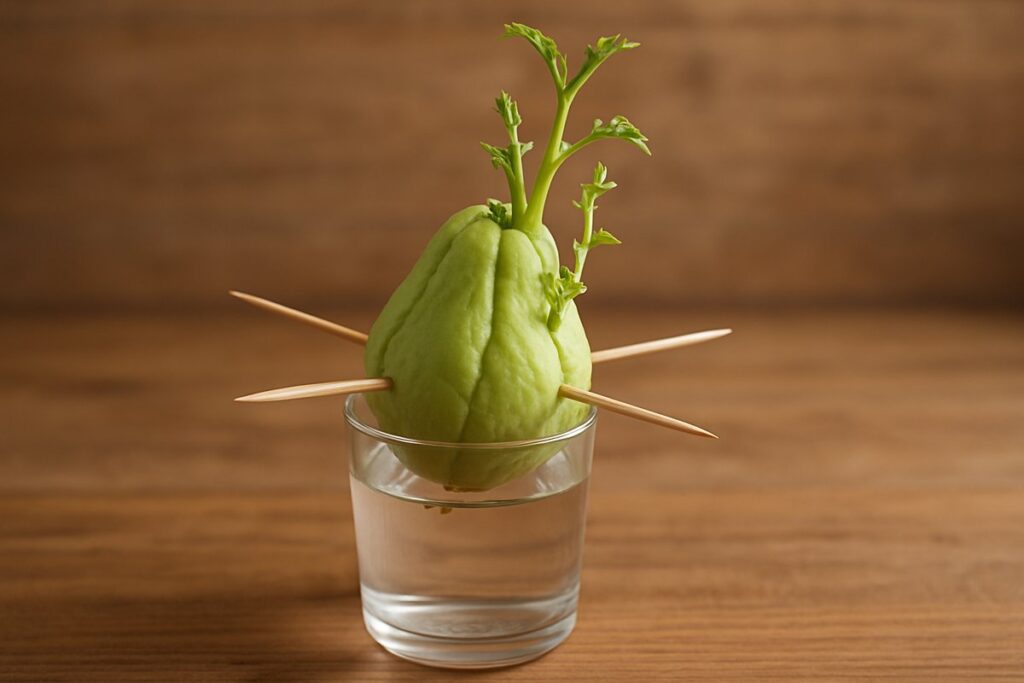 Encha um recipiente com água limpa e filtrada. Espete palitos de dente nas laterais do chuchu e apoie-o sobre o recipiente. Os palitos servem para manter o fruto firme, evitando que ele afunde totalmente na água.