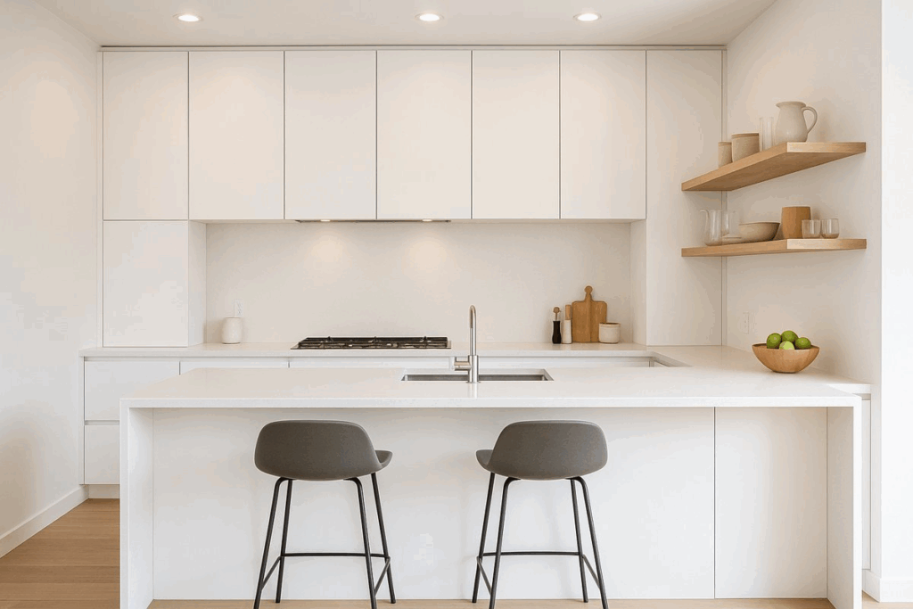Detalhes como prateleiras abertas com utensílios elegantes, plantas em vasos minimalistas e eletrodomésticos embutidos garantem harmonia e sofisticação.