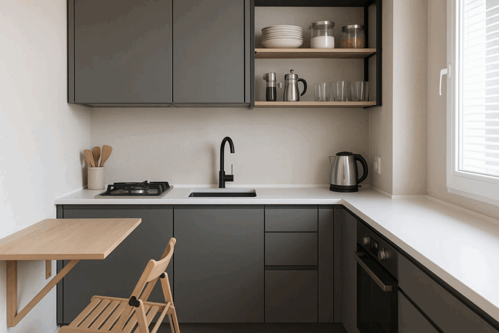 Dessa forma, mesmo em espaços reduzidos, é possível criar uma cozinha compacta, elegante e completamente funcional, que aproveita luz e layout de forma inteligente.