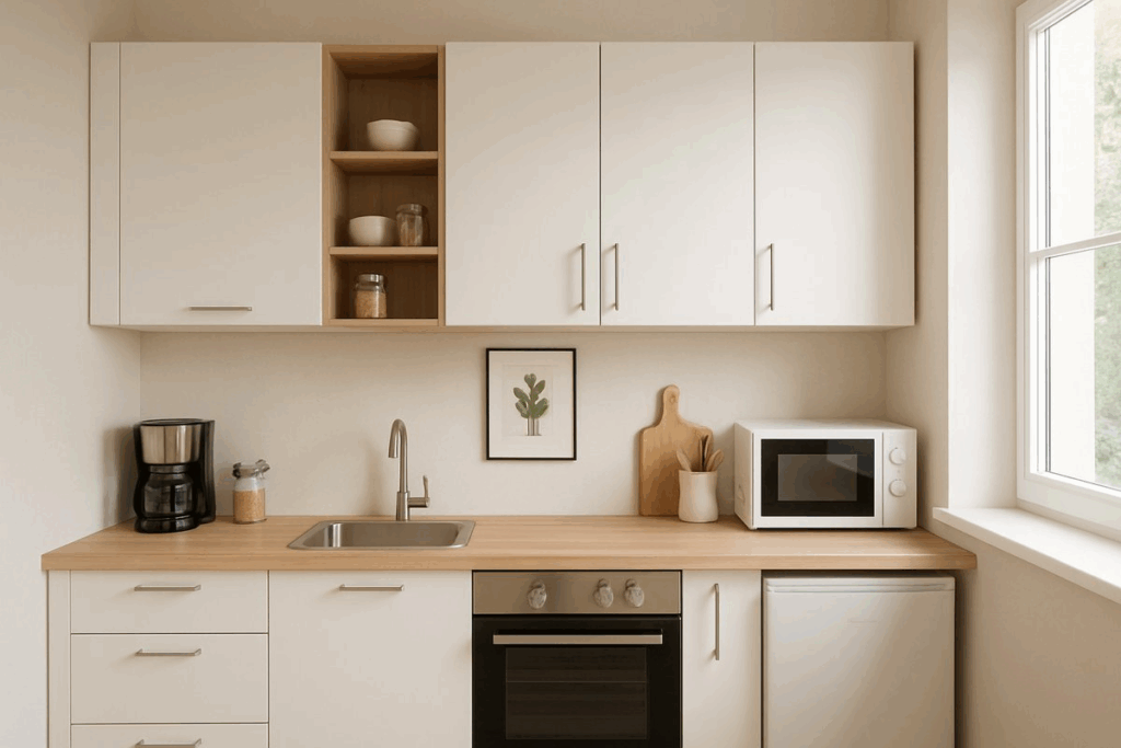 Pense em um apartamento novo, ainda sem grandes reformas. A cozinha modulada é composta por armários brancos padrão, bancada em madeira clara e eletrodomésticos compactos.