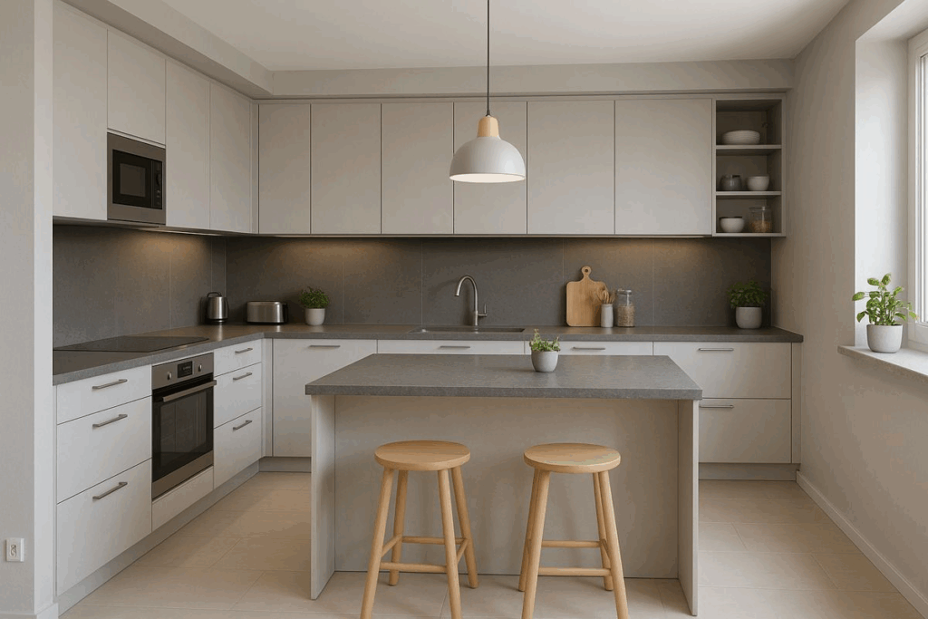 Imagine uma cozinha espaçosa em apartamento médio, paredes em tons suaves de cinza e piso de porcelanato claro.