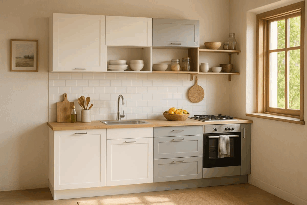 Visualize uma cozinha prática e descontraída em uma casa de praia ou campo. Armários modulados em tons neutros, como branco e cinza, são dispostos de forma funcional, sem ocupar toda a parede.