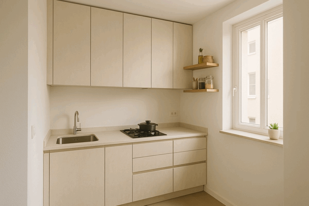 Imagine uma cozinha em apartamento pequeno, com paredes brancas e iluminação natural que entra por uma janela lateral.