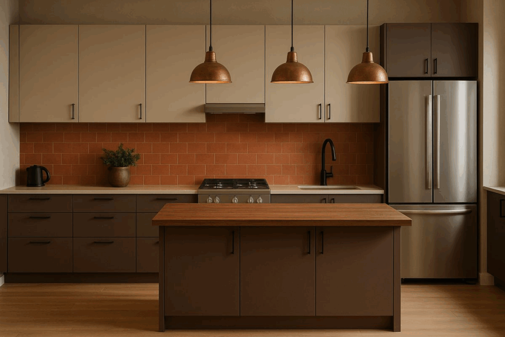 A cozinha pode ganhar armários em tons de madeira natural ou cerâmicas em terracota. Esses elementos tornam o espaço acolhedor e sofisticado.