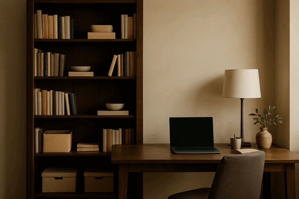 Uma estante em madeira escura combinada com paredes em tom areia traz equilíbrio entre seriedade e aconchego.