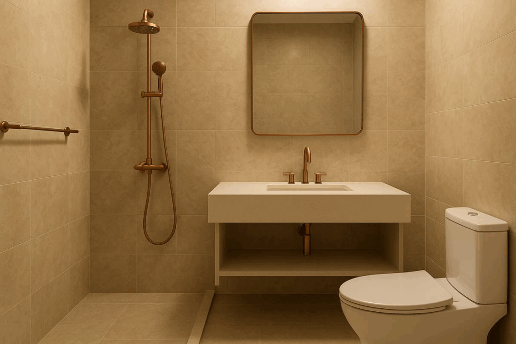 Paredes revestidas em porcelanato bege combinadas com metais em cobre tornam o espaço elegante e acolhedor.