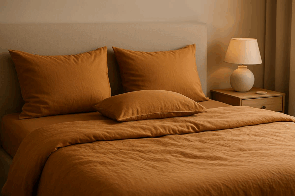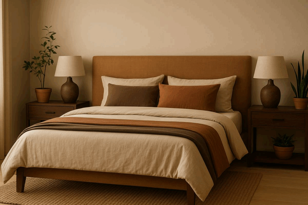 Roupas de cama em caramelo, combinadas com cabeceira estofada em bege, criam um espaço relaxante.
