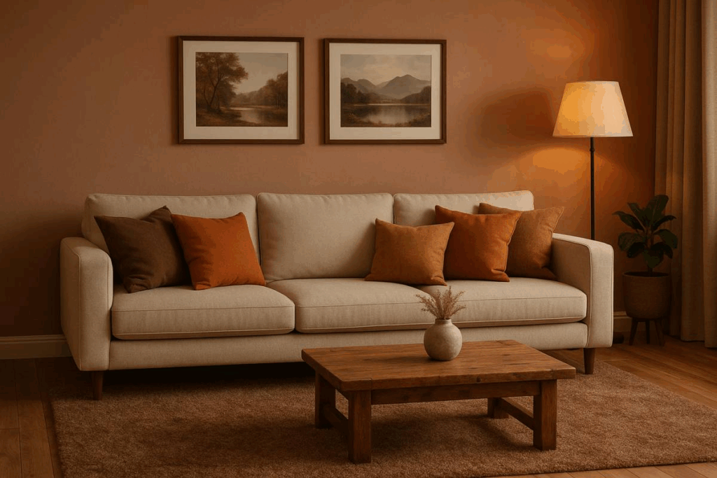 Almofadas, mantas, quadros e pequenos objetos decorativos nos tons terrosos são formas simples de equilibrar o estilo sem precisar de grandes mudanças.