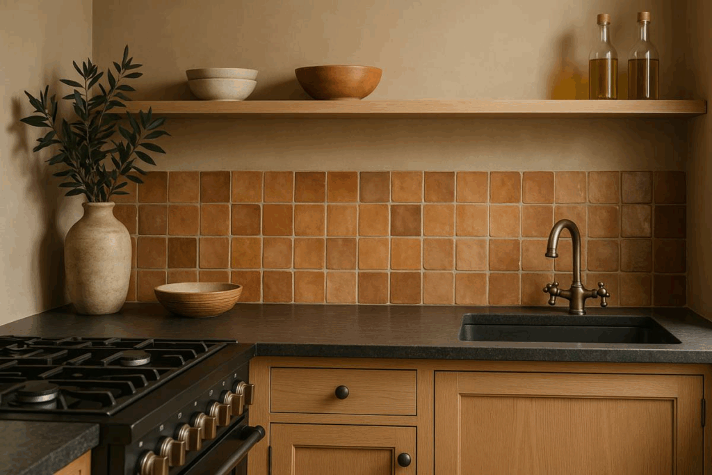 Azulejos em tons de argila no backsplash da cozinha trazem charme e sofisticação.