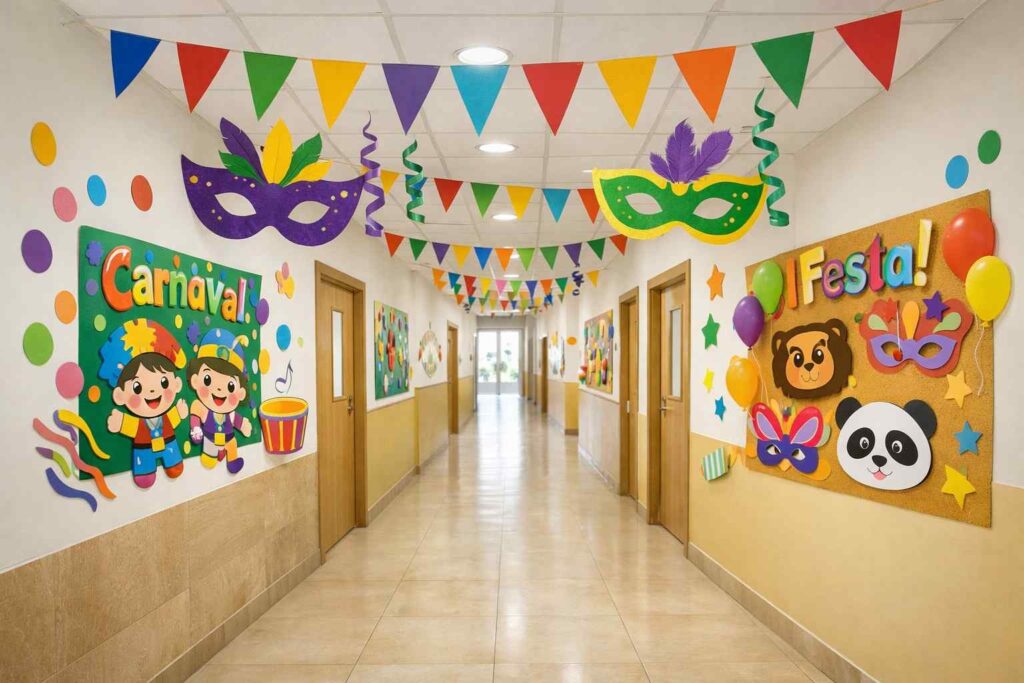 Com ideias simples, materiais acessíveis e foco no coletivo, a decoração se transforma em uma experiência rica, colorida e alinhada ao espírito do Carnaval, sem comprometer o orçamento escolar.