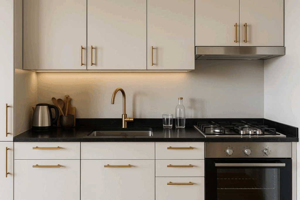 Optar por armários brancos ou em tons suaves, como bege, cinza claro ou off-white, ajuda a suavizar o impacto da bancada preta.