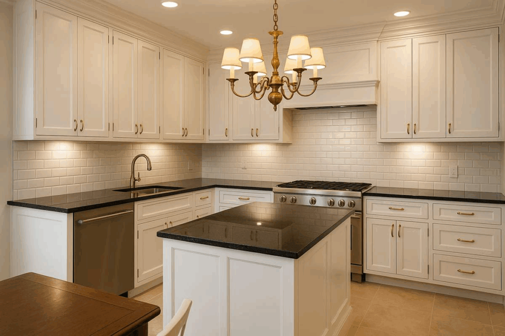 Uma iluminação bem planejada é essencial para valorizar a bancada preta em cozinhas pequenas.