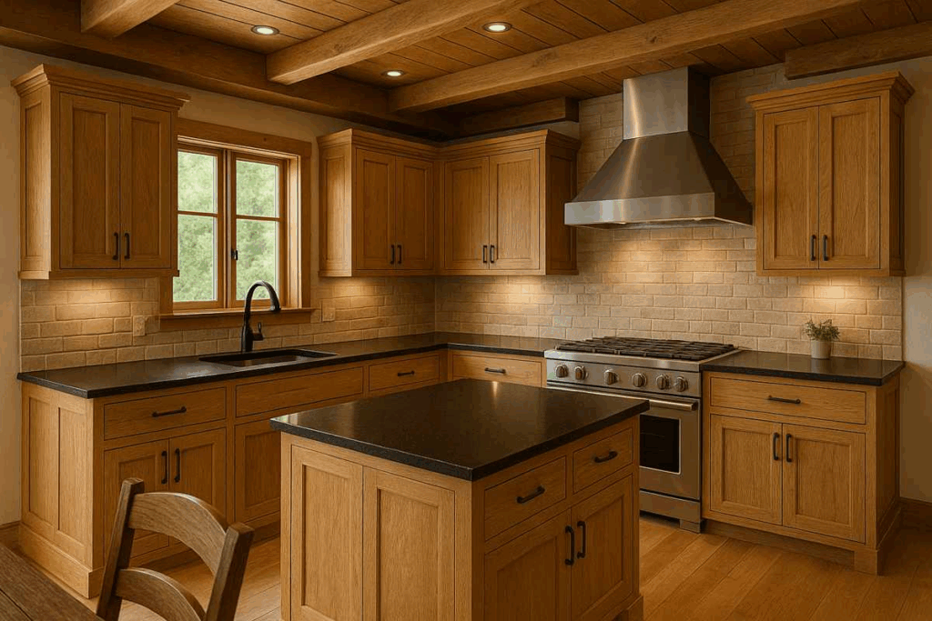 2. Cozinha rústica com madeira e granito preto