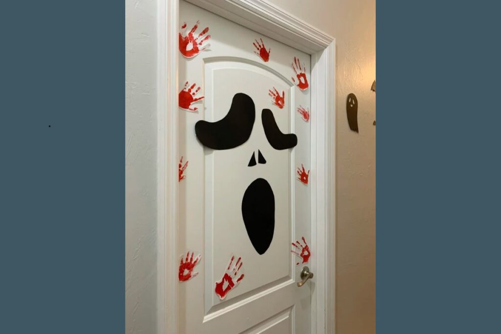 Transforme uma porta comum em um cenário digno de filme de terror! Corte formas de olhos e boca em cartolina preta e cole na parte central da porta.