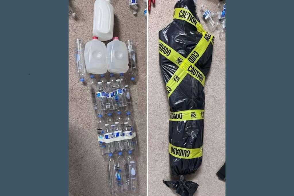 Depois, envolva tudo com sacos pretos e fita adesiva amarela com a palavra “Cuidado”. O resultado é uma escultura realista e ideal para áreas externas.
