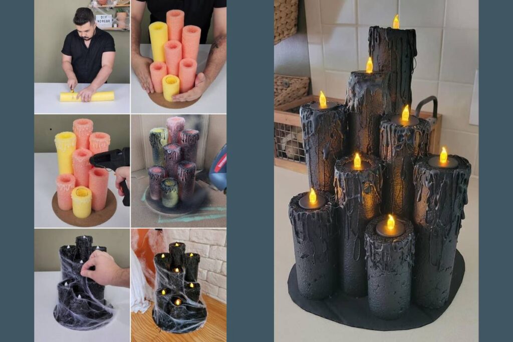 Em seguida, use cola quente nas bordas superiores para criar o efeito de cera derretida. Depois de seco, pinte tudo de preto e finalize com pequenas luzes LED dentro.
