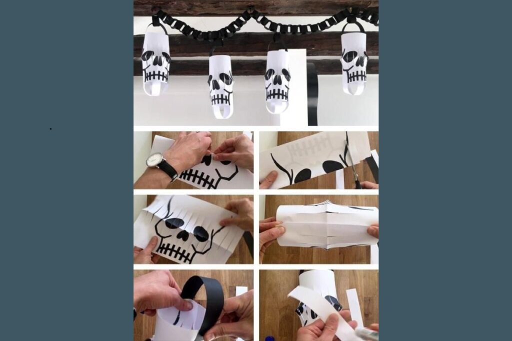 Essas luminárias de papel são criativas e fáceis de fazer. Basta imprimir rostos de caveira, cortar as partes necessárias e dobrar conforme as instruções.