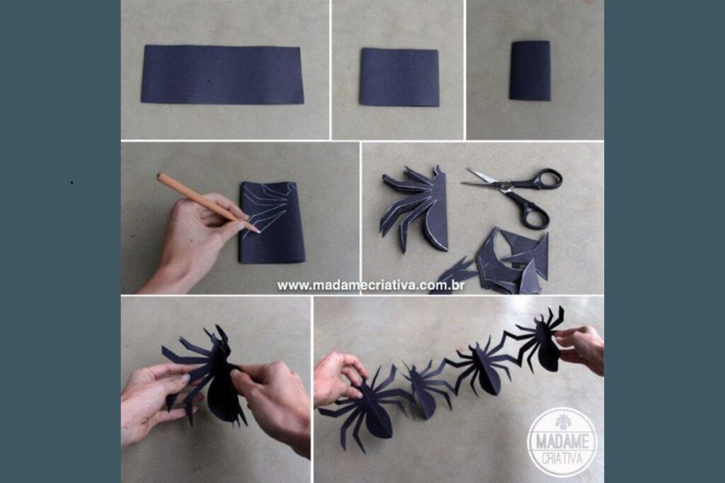 Outra opção de decoração de Halloween faça você mesmo é a corrente de aranhas. Corte tiras de papel preto, dobre ao meio e desenhe o formato das aranhas.