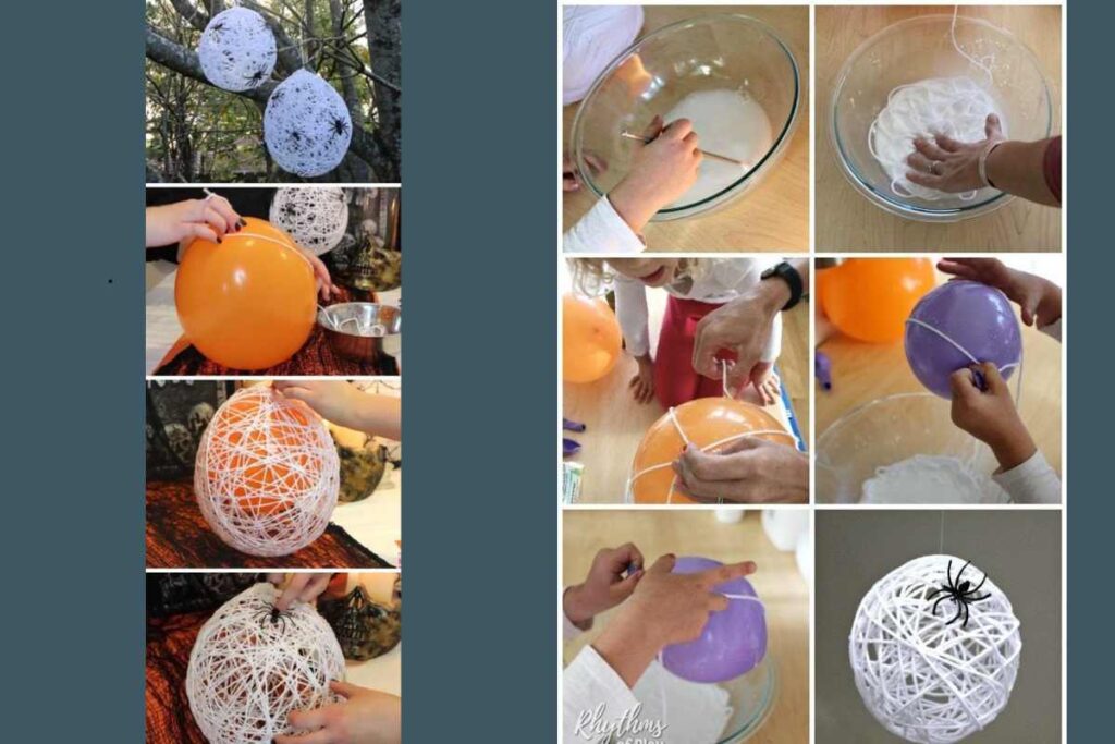 Depois que a cola secar, estoure o balão e retire-o, deixando apenas a estrutura de barbante. O resultado são esferas leves, parecendo teias de aranha flutuantes.
