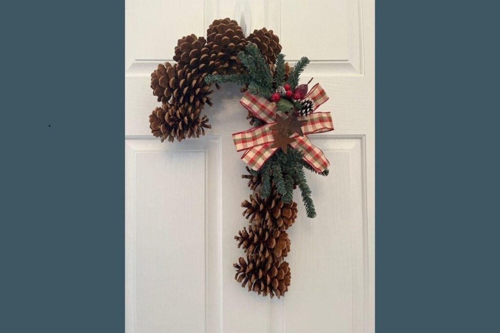 O laço xadrez e os galhos verdes trazem contraste e deixam a peça mais charmosa. É uma ótima opção de decoração de Natal DIY para portas de entrada.