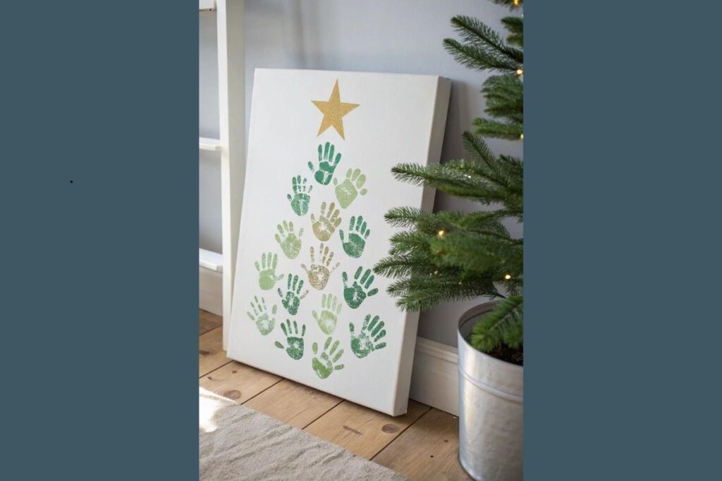 Uma ideia criativa e afetiva. As mãos carimbadas formam o desenho da árvore e podem representar toda a família.