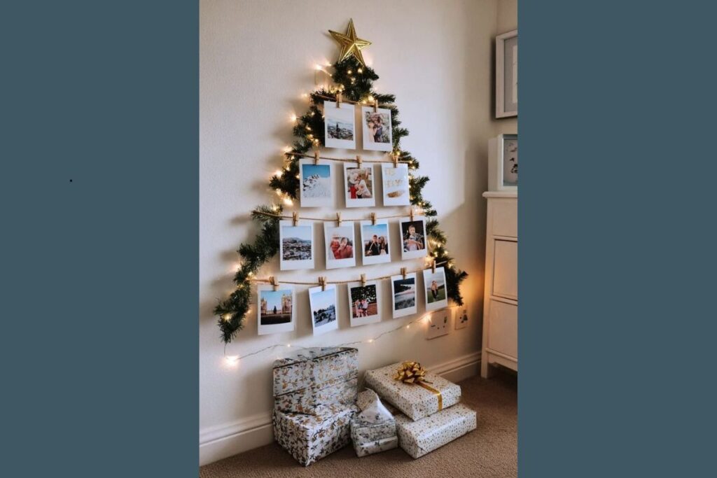 Essa proposta é prática e ocupa pouco espaço. Os galhos ou fios formam o contorno da árvore, enquanto as fotos substituem os enfeites tradicionais. É uma Decoração de Natal DIY que une memória e decoração, perfeita para ambientes pequenos.