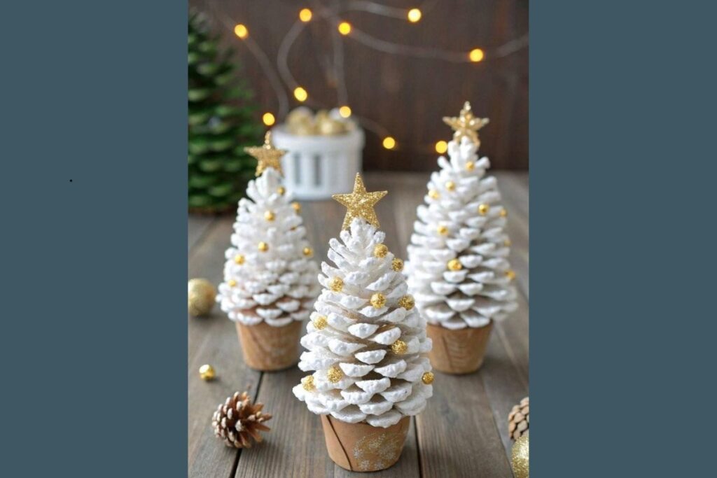 Uma ideia econômica e delicada. As pinhas recebem tinta branca ou detalhes dourados, criando o efeito de árvore nevada. Podem ser usadas em conjunto ou separadas, formando pequenos cenários natalinos.