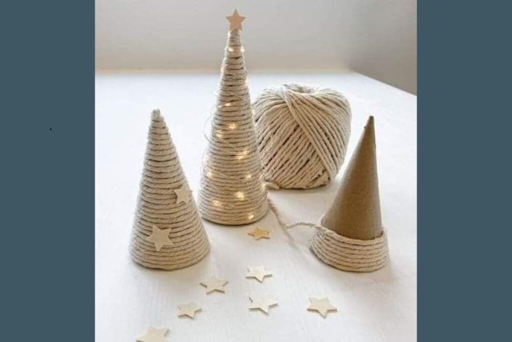 Essas mini árvores são simples e versáteis. O barbante cria textura e pode ser usado em tons neutros ou coloridos.