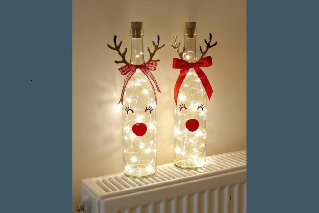 Garrafas de vidro ganham nova vida com luzes internas e detalhes como laços, olhos e nariz.