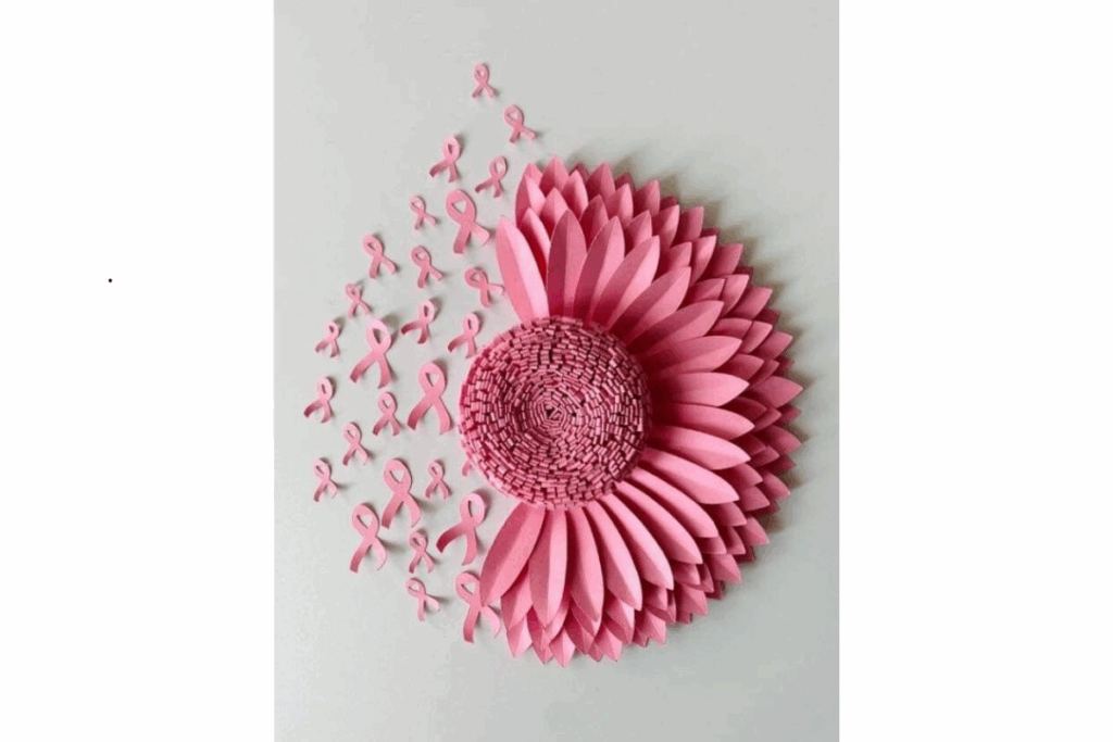 Um modelo artístico e sensível: a flor feita com papel rosa representa a força e delicadeza feminina, enquanto os mini laços completam a mensagem de apoio à causa. Pode ser usada em murais ou vitrines.