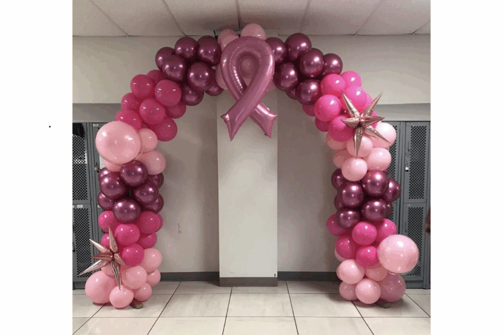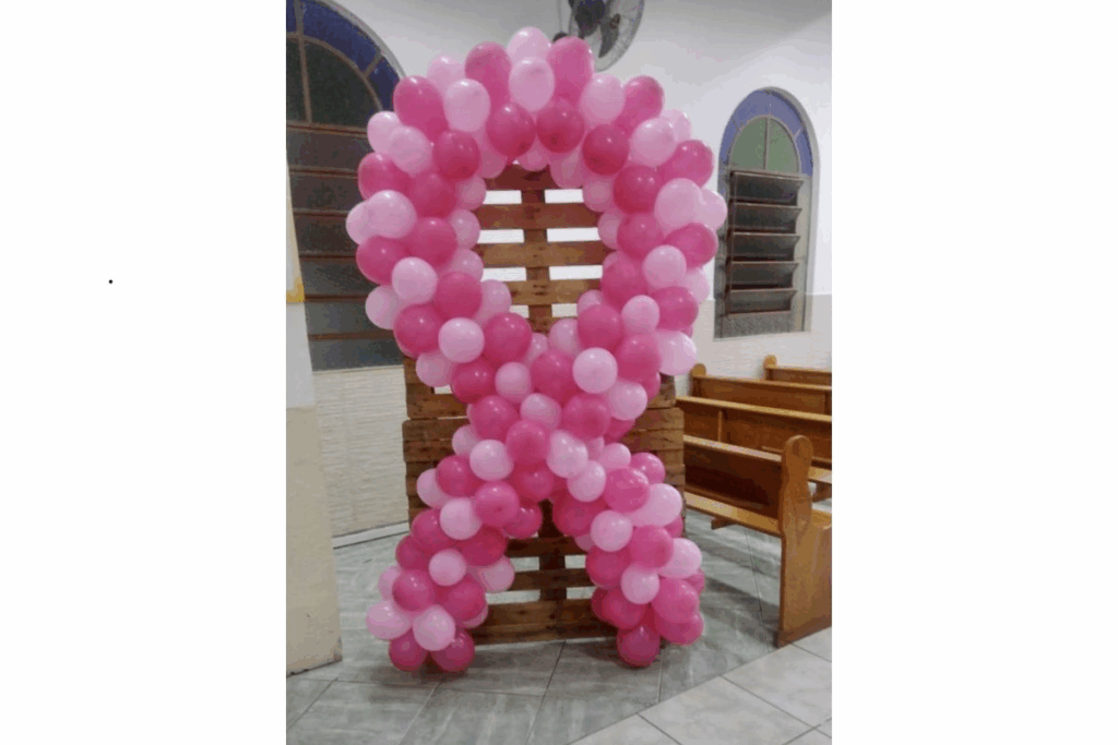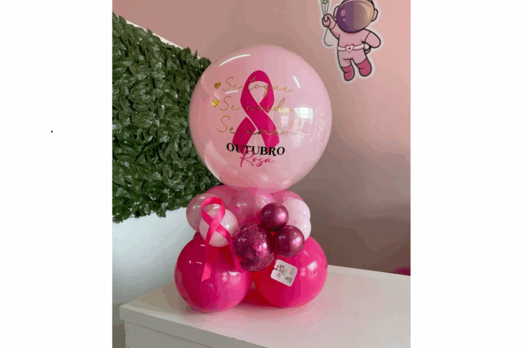 Essa decoração é delicada e perfeita para recepções ou mesas de entrada. O arranjo de balões em tons de rosa carrega o laço símbolo do Outubro Rosa e a frase “Se toque, se cuide, se ame”.