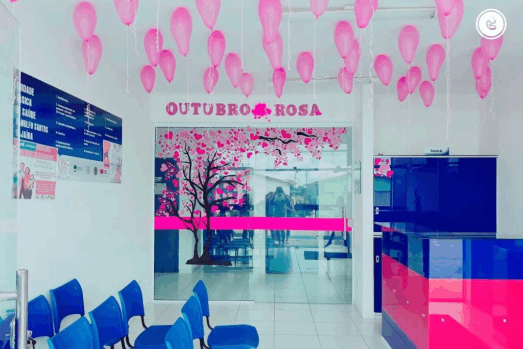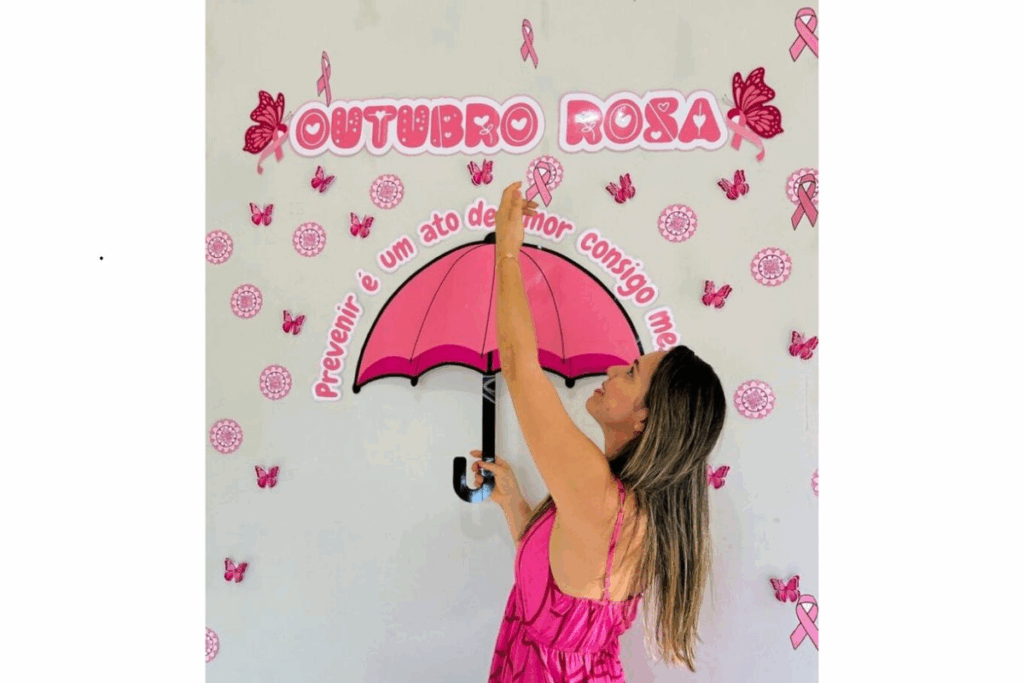 Decorar o ambiente é uma maneira de transformar a mensagem em algo visível e acolhedor. Cada detalhe em rosa, cada laço e cada balão reforça a importância da prevenção.