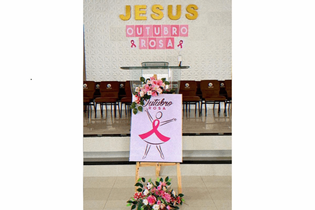 A decoração traz um toque elegante com flores, tons suaves e a frase “Outubro Rosa” destacada atrás do púlpito.