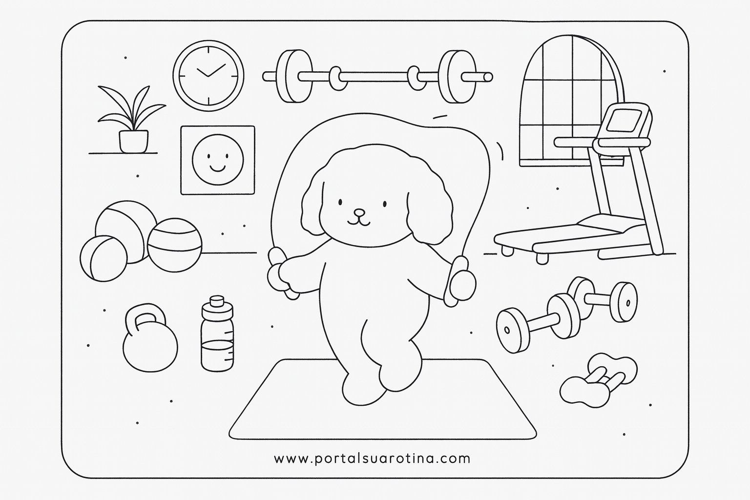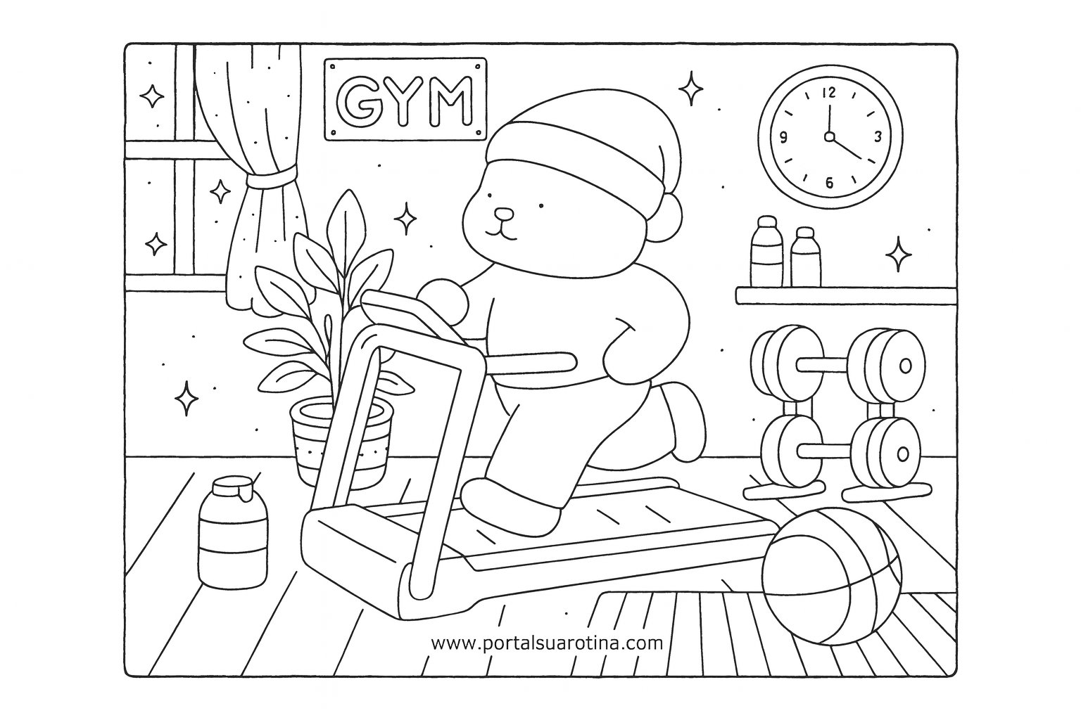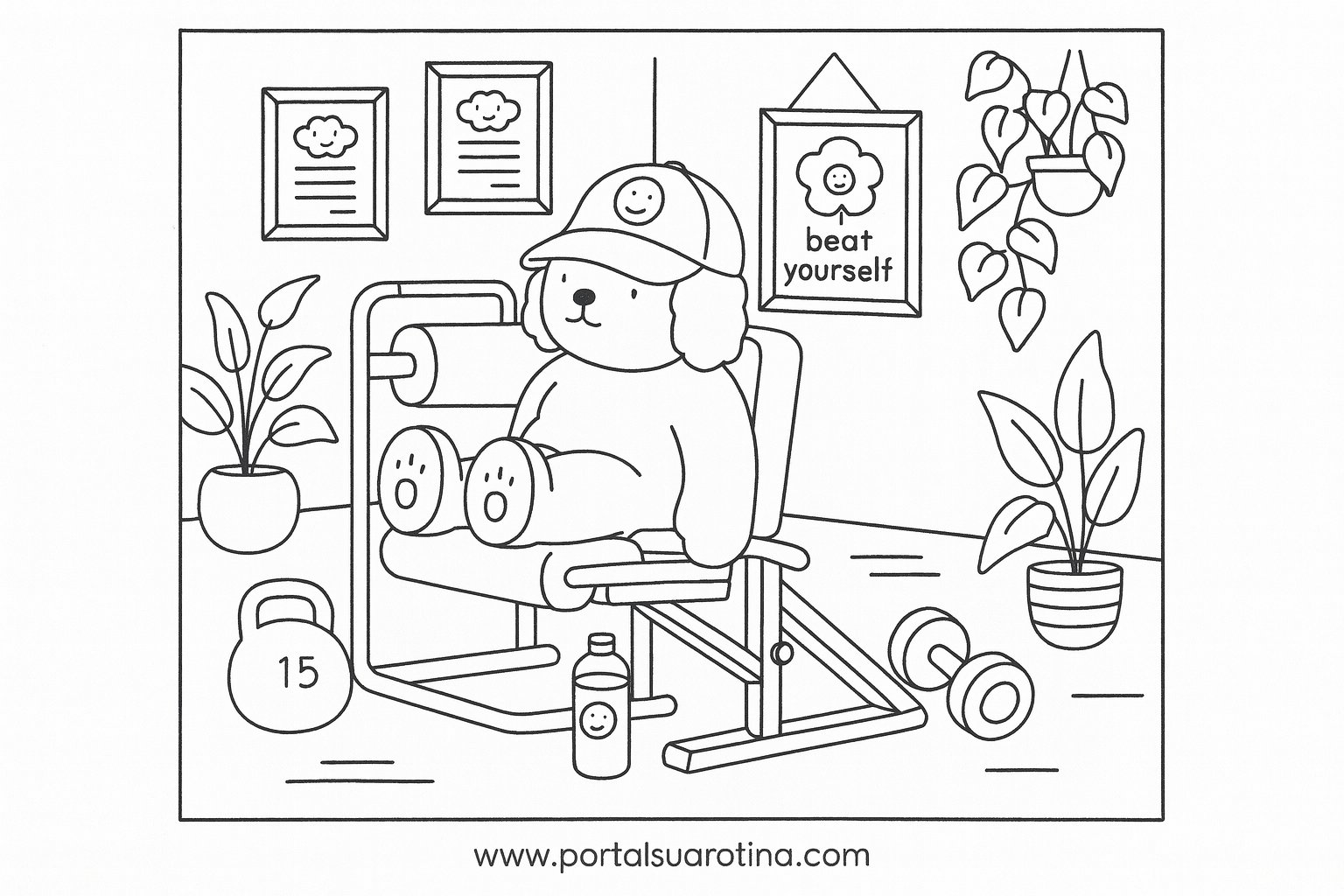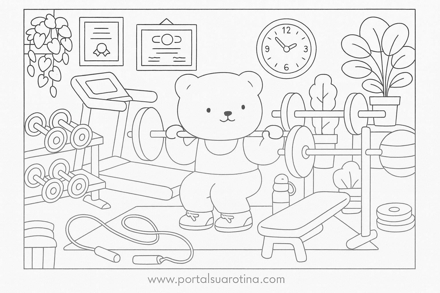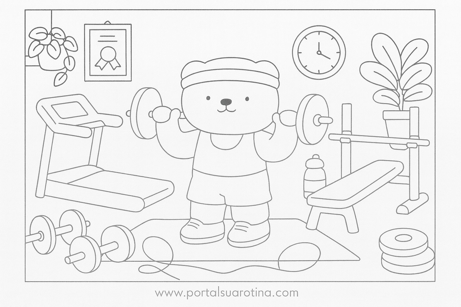 As ilustrações trazem cenas leves, com equipamentos de exercícios, poses engraçadas e elementos que deixam o ambiente de academia mais lúdico. São modelos ideais para imprimir, usar em casa, na escola ou em atividades de artes.