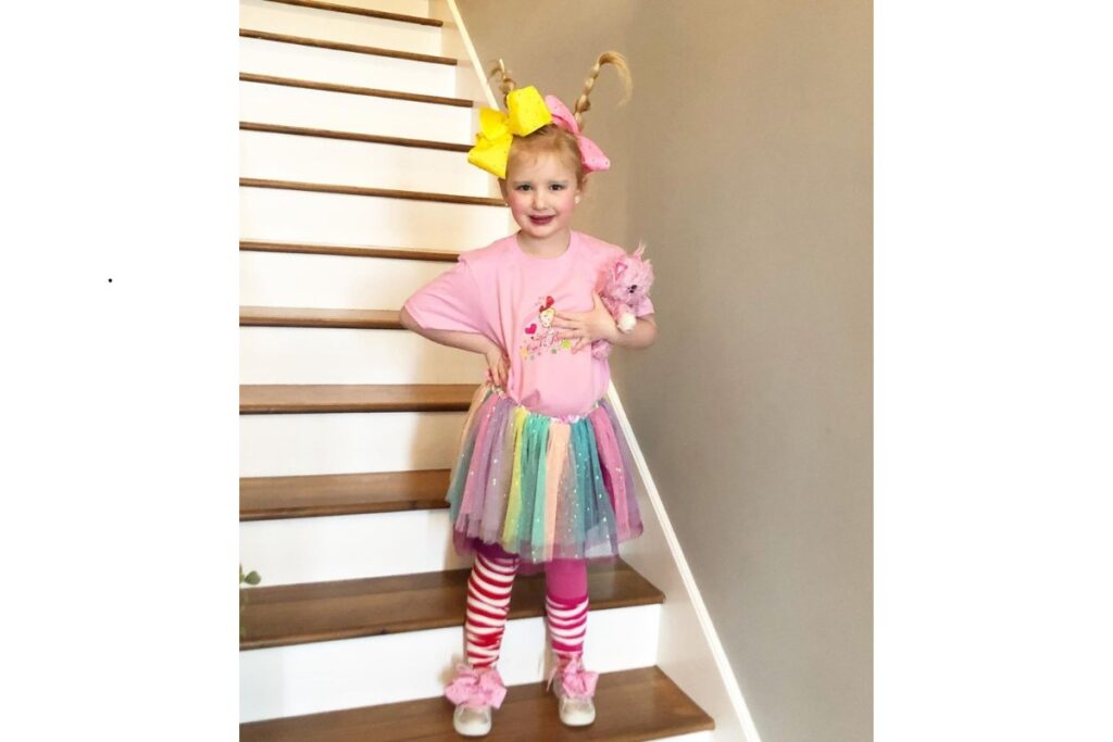 Aqui, a combinação de saia pink com leggings estampadas e tênis enfeitados com laços enormes cria um look fofo e divertido. O cabelo preso em maria-chiquinha com adereços completa o visual.