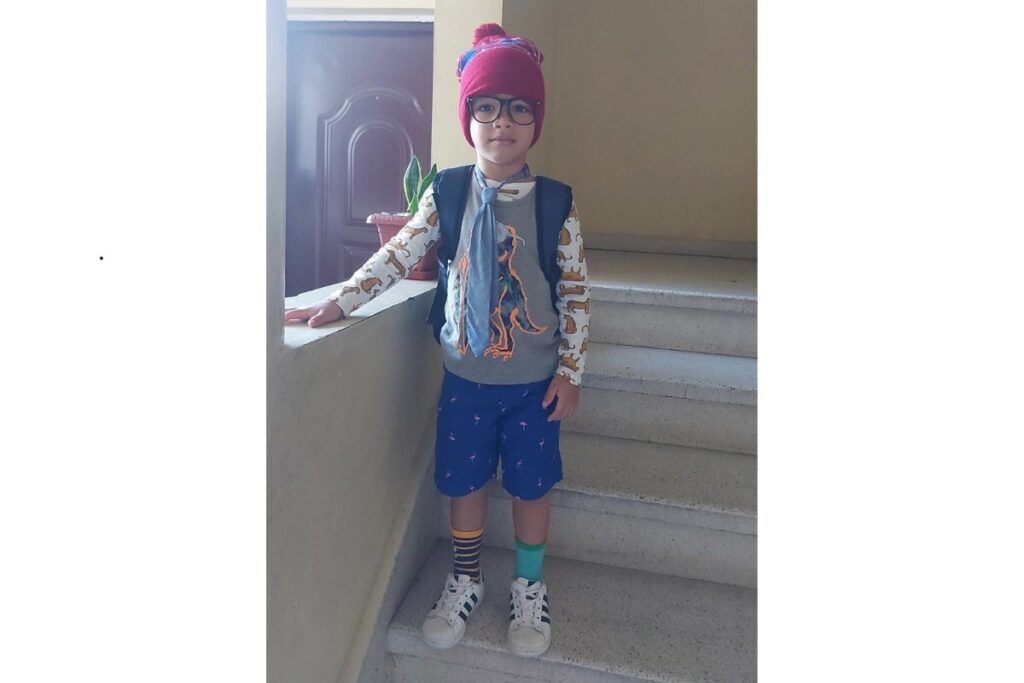 O visual mistura gorro, óculos, gravata e estampas de bichinhos na blusa, com bermuda florida e meias de cores diferentes. É um exemplo perfeito de como unir peças aleatórias cria um resultado engraçado.
