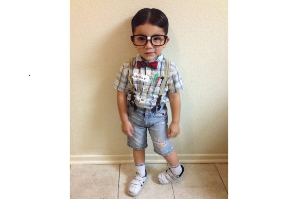 Nesse visual, a proposta foi brincar com o estilo “nerd”: óculos grandes, suspensórios, gravata borboleta e canetas no bolso. O resultado é fofo, engraçado e cheio de detalhes criativos.