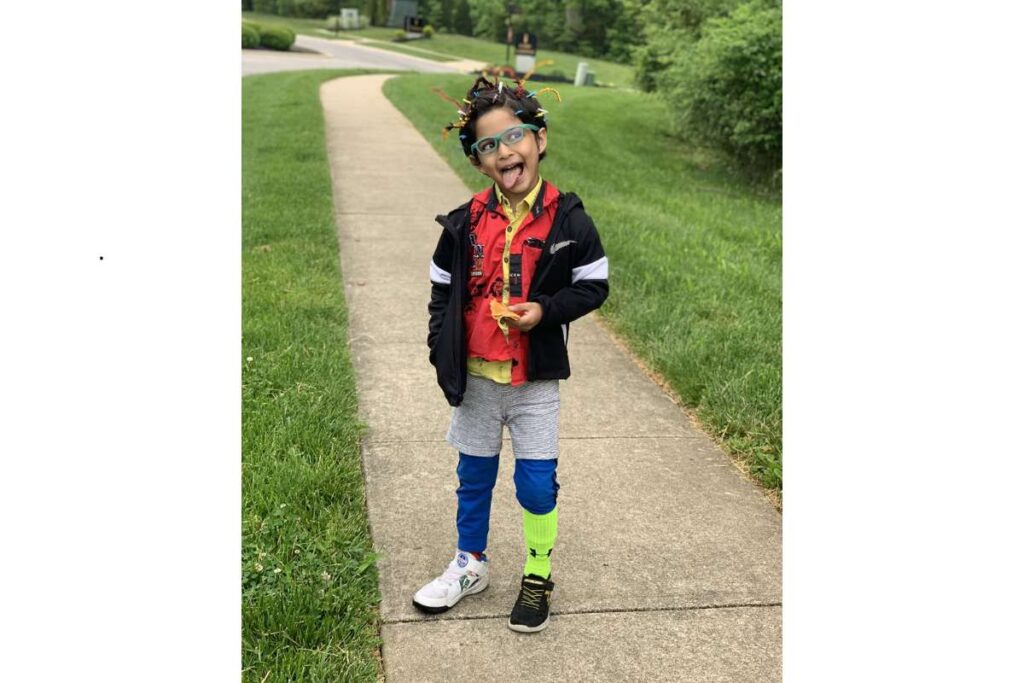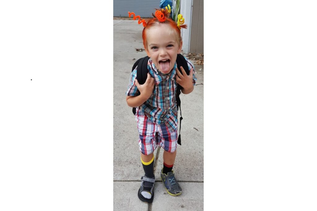 O primeiro look traz um menino cheio de estilo com calça colorida de duas cores, meias diferentes e tênis trocados. No cabelo, os limpadores de cachimbo deram um toque ainda mais divertido e criativo.