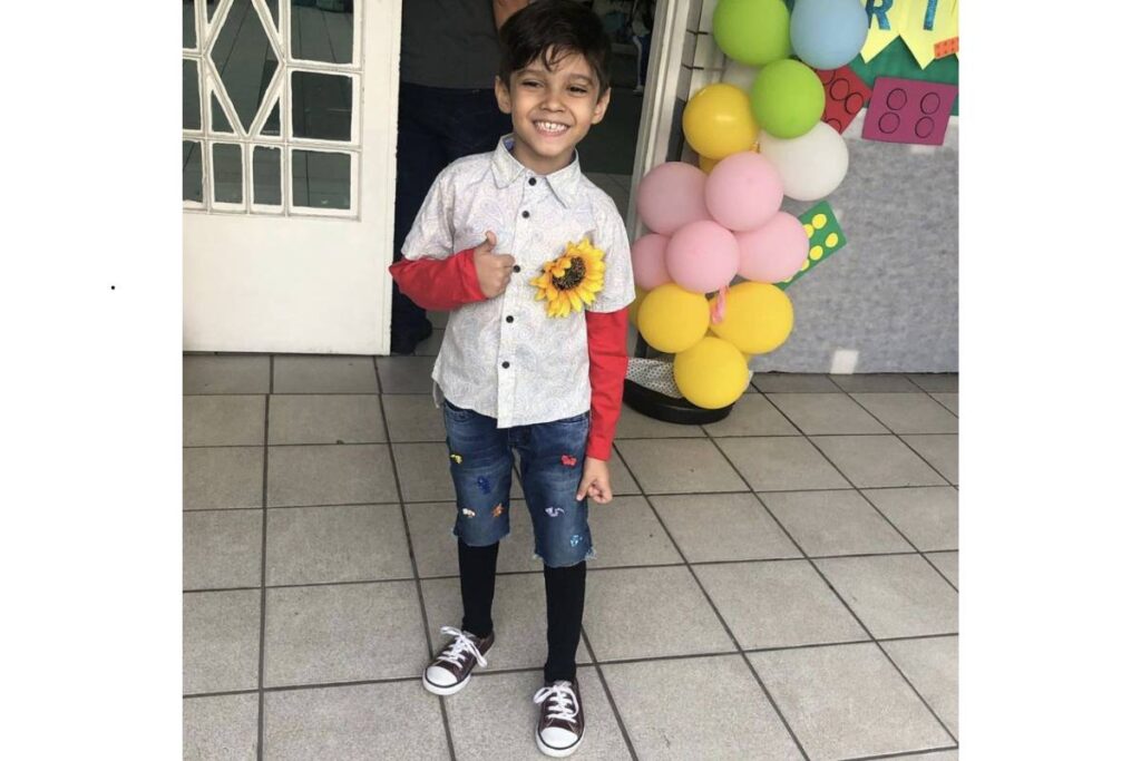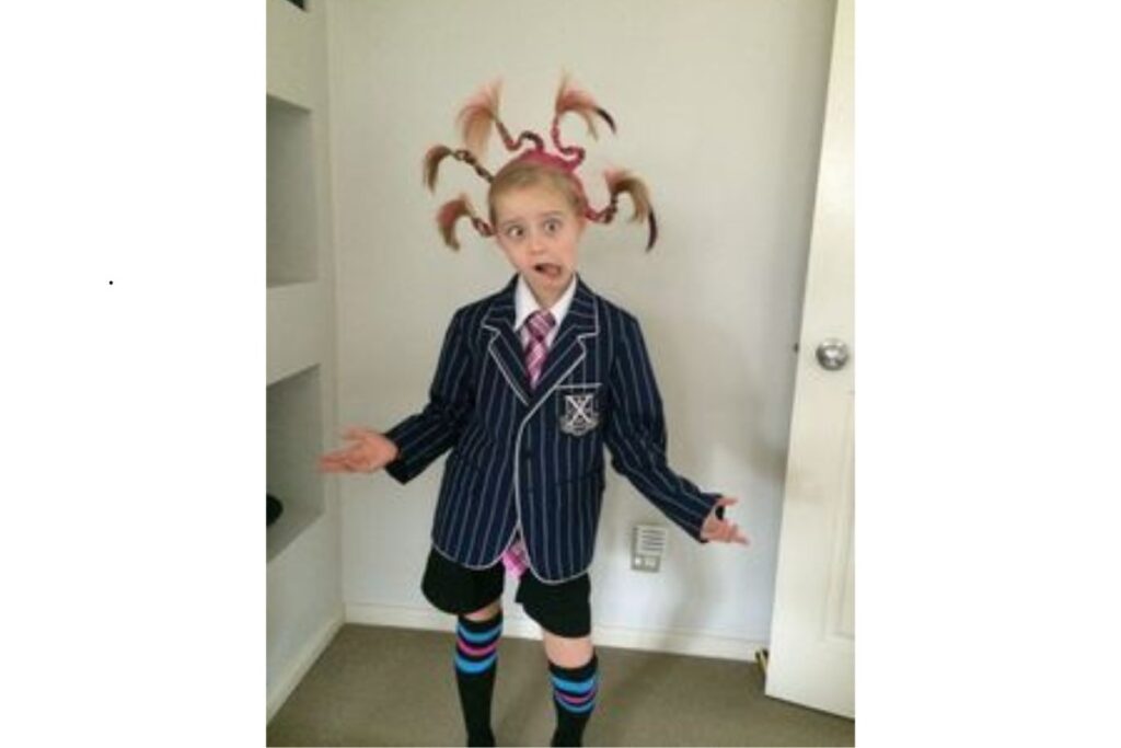 Aqui, a criança combina o uniforme escolar clássico com um cabelo totalmente espetado e preso em várias partes. O contraste entre o tradicional e o maluco deixa o visual engraçado e chamativo.