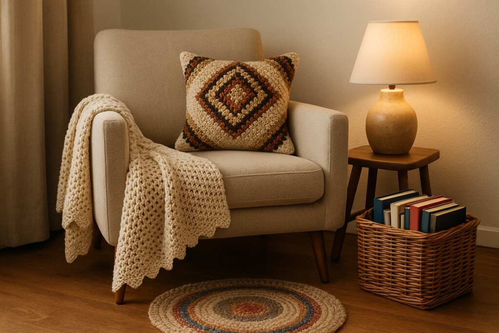 Monte um espaço com uma poltrona neutra, manta de crochê, almofada artesanal e luminária de cerâmica. Acrescente um tapete pequeno feito à mão e um cesto de vime para livros.