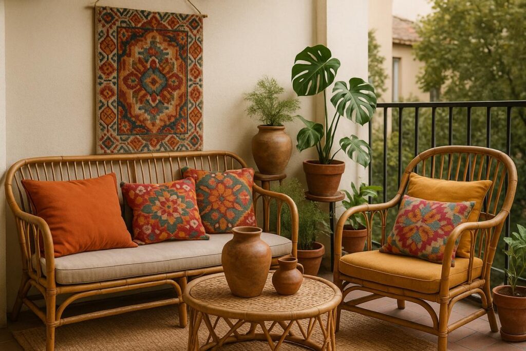 Use móveis de bambu ou madeira artesanal. Combine com almofadas coloridas e uma tapeçaria pendurada na parede. Complete com vasos cerâmicos artesanais.