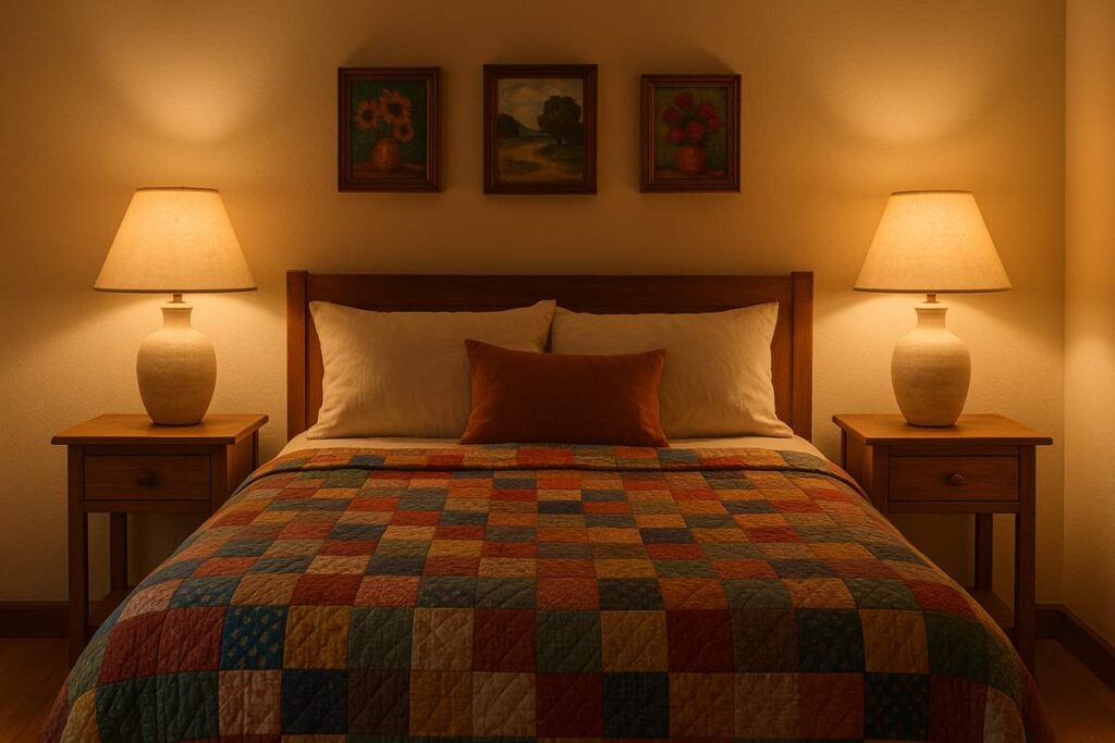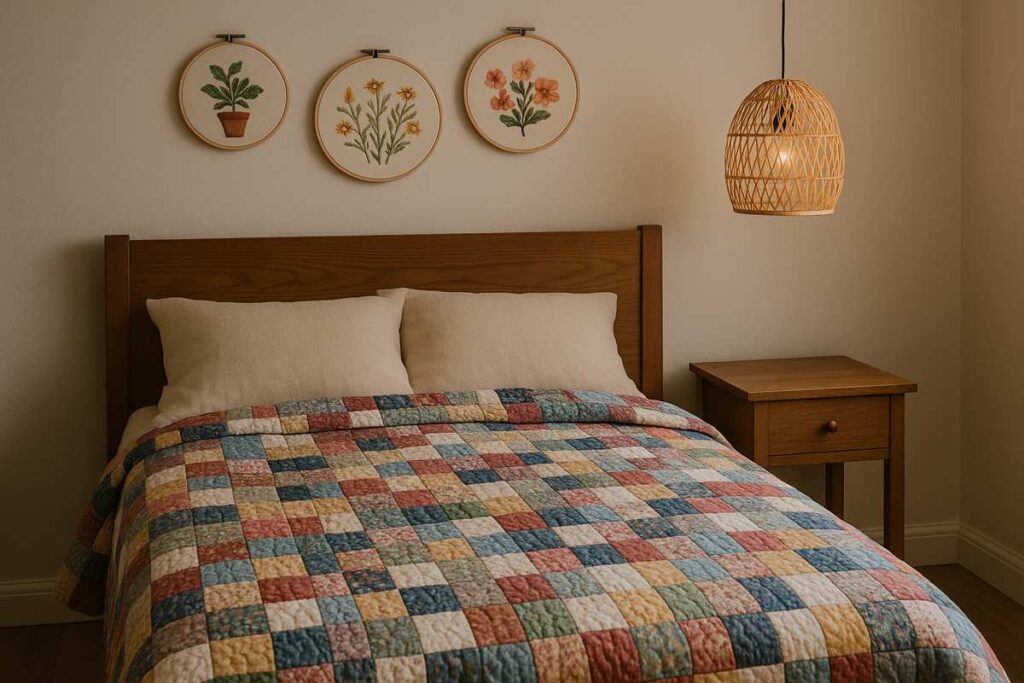 Aposte em uma colcha de patchwork artesanal, luminárias de cerâmica no criado-mudo e quadrinhos pintados à mão.