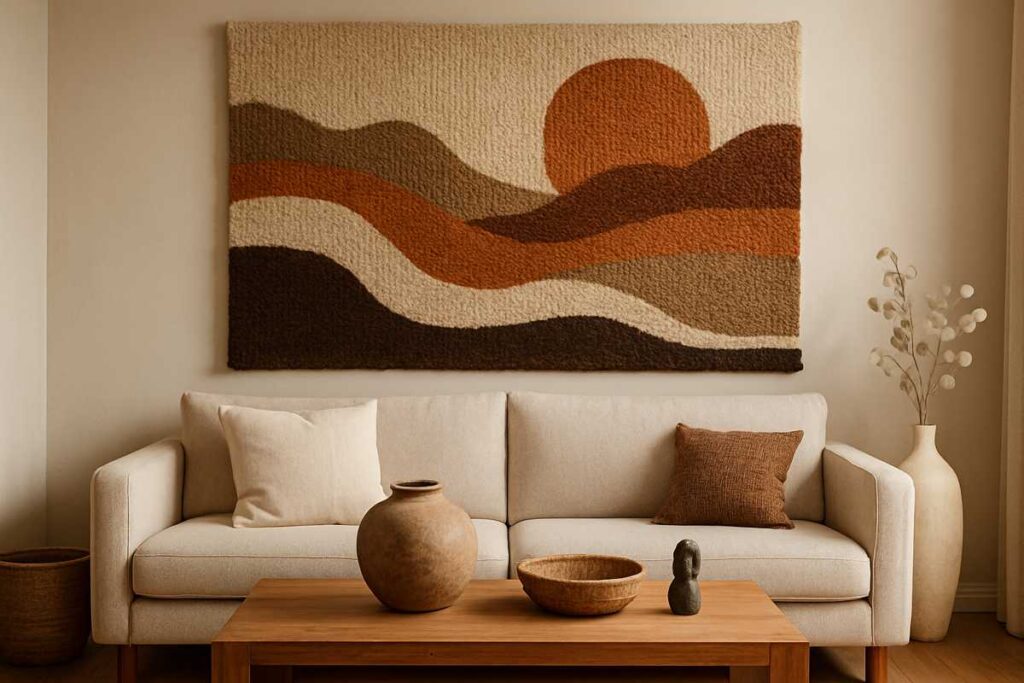 Escolha uma tapeçaria artesanal grande para uma das paredes e complemente com objetos menores, como vasos, cestos ou esculturas.