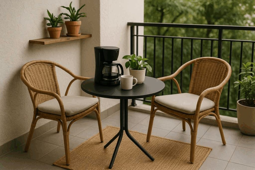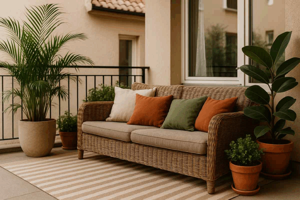 Se a varanda recebe sol, chuva ou vento, escolha tapetes de materiais resistentes como polipropileno, sisal sintético ou fibras náuticas.