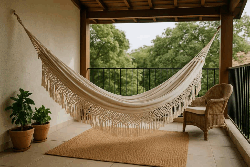 Um tapete de fibras naturais sob a rede cria uma atmosfera rústica e acolhedora, perfeita para descanso.