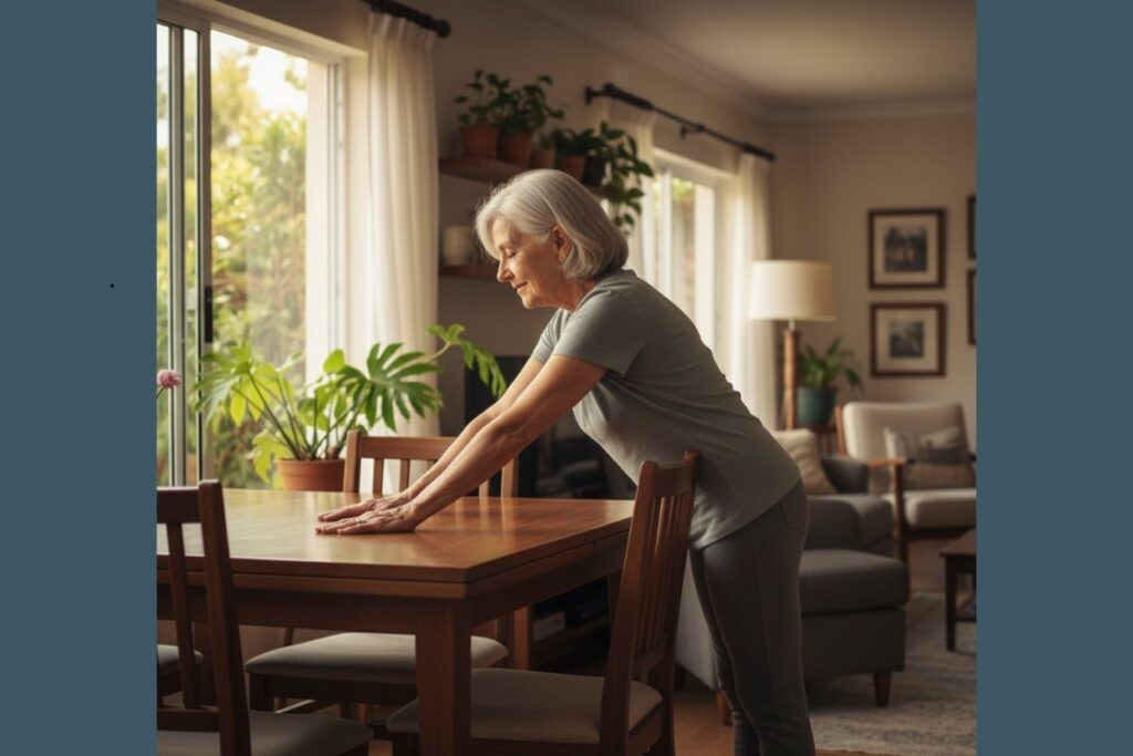 Com as mãos apoiadas em uma mesa, incline o tronco levemente para frente, mantendo a coluna alinhada. Esse alongamento melhora a postura e ajuda na mobilidade do tronco.